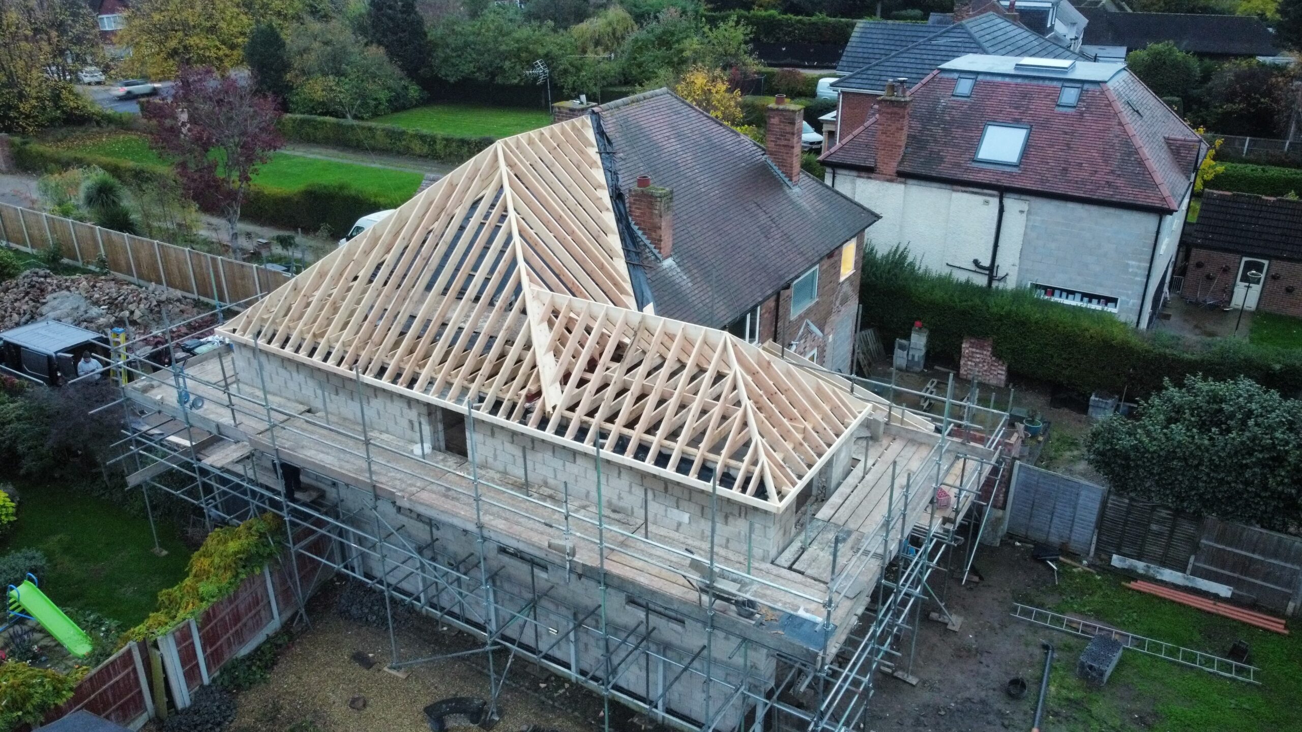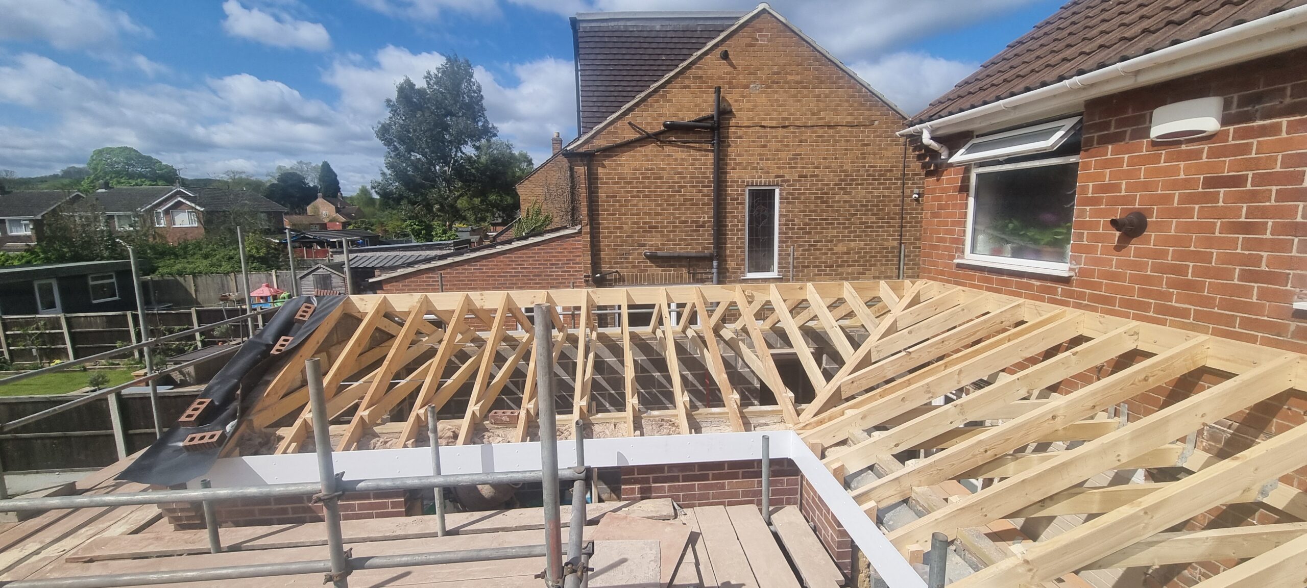 We specialise in the timber carpentry element of the roof — the structural framework, battening, and fascia work. We do not tile or slate roofs ourselves, but we work closely with trusted local roofers who can complete the weatherproofing once our carpentry is finished. We are happy to coordinate this for you if needed.